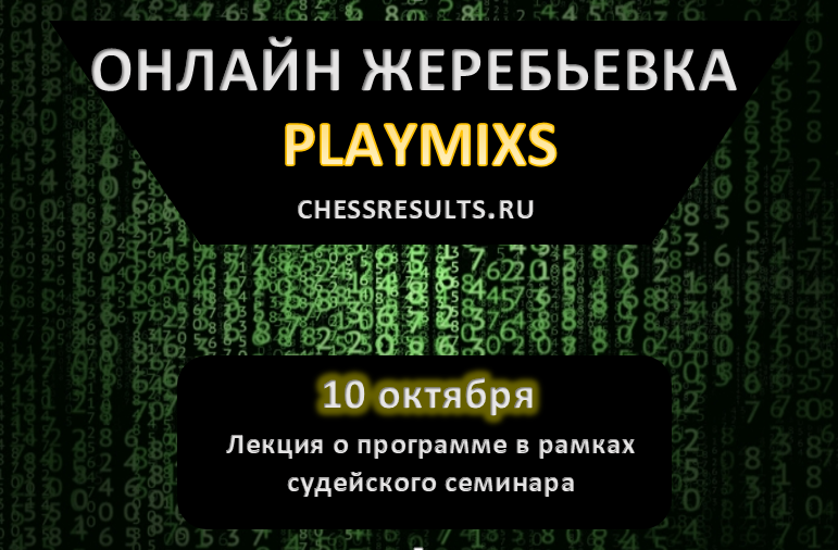 10 октября в 16.00 в Истре (ШК им. Мамченко) в рамках судейского семинара состоится эксклюзивная лекция по отечественной программе онлайн-жеребьёвки Playmixs (chessresults.ru)