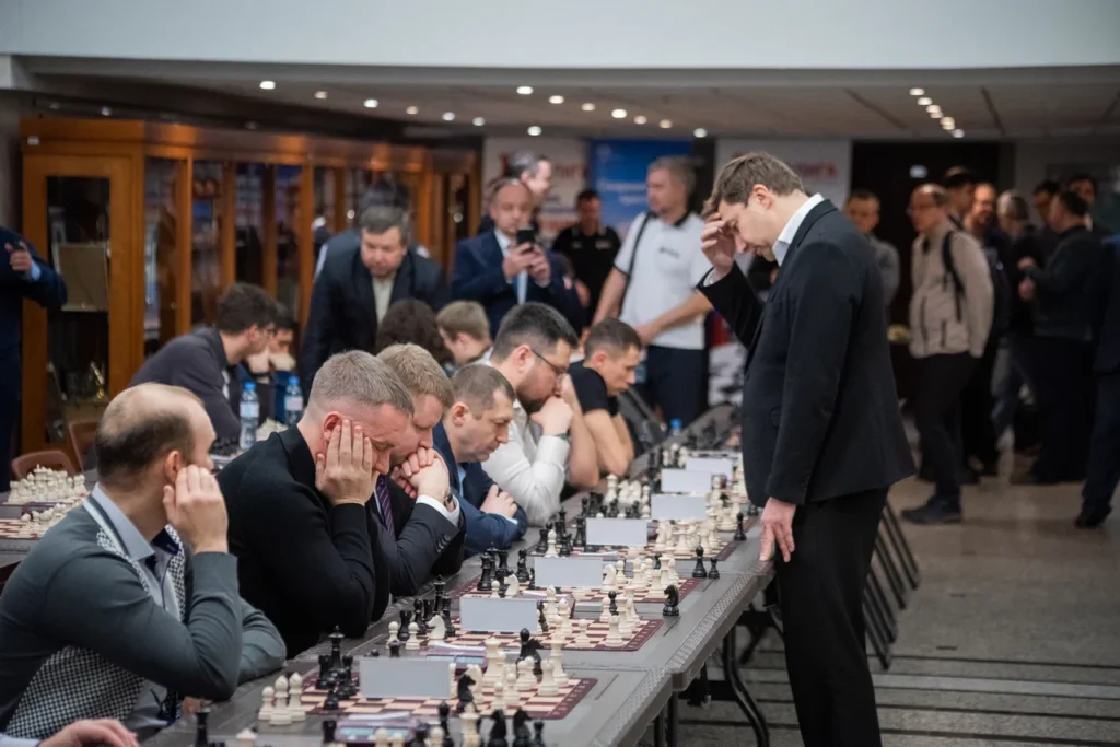 Сергей Карякин дает сеанс одновременной игры.