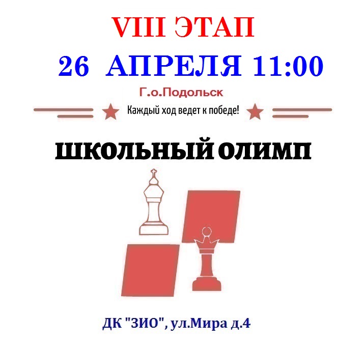 26 апреля в Подольске состоится VIII этап серии по быстрым шахматам «Школьный Олимп»