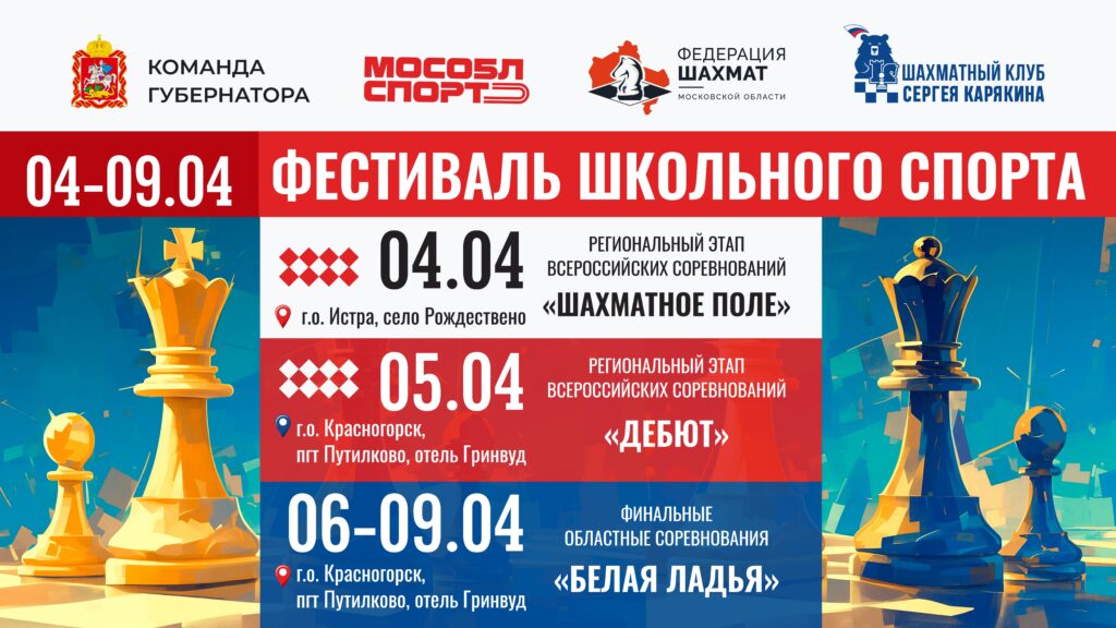 В начале апреля в Московской области впервые пройдет Фестиваль школьного спорта, в рамках которого состоятся сразу несколько соревнований: областные этапы «Белой ладьи», «Дебюта» и «Шахматного поля»!
