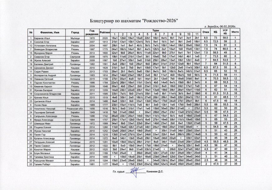 По 8,5 очков из 11 возможных набрали Илья Баранов из Мытищ и Егор Соколов из Зарайска. Кубок и золотая медаль досталась Илье Баранову благодаря немного лучшему коэффициенту Бухгольца. Третье место поделили сразу три шахматиста из Рязани! Более удачливой оказалась Ангелина Устинович — у нее бронзовая медаль.